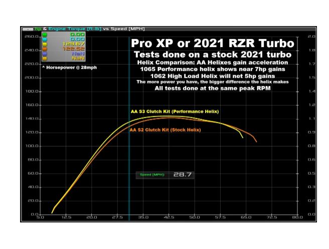 - High Load Helix 107-1042 or 107-1062: Slightly less aggressive than the performance helix with good acceleration gains/power transfer over the OEM helix. Designed to work better for heavier vehicles, heavier tires, heavy sand load or crawling type riding in mind. Works on Pro XP 2 seat 30-35" Dirt Tires, 30-32" dune paddles. Works on Pro XP 4 seat with 30-35" dirt tires, 28-32" dune paddles. Works on Turbo R 2 & 4 seat models with 32-35" tires or 30-33" paddles. Excellent all around helix for any Pro XP or Turbo R!