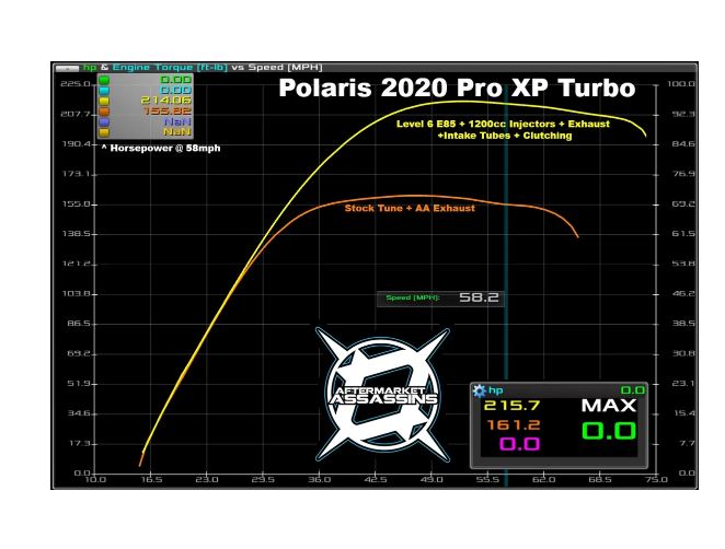 - Level 5 1200cc Injectors, Waste Gate Rod Shortened - Beast mode times x2 - 210 RWHP! This tune is designed for 108-110 octane Now for the fun part.... this tune is INSANE and brings your Pro XP to a new level at 210 RWHP on our dyno. This tune gains 50-55 RWHP and pushes the boost level to 24-25 PSI peak, then settles to 23-24 PSI. Keep in mind the Powervision boost only reads to 22-23 PSI (depending on your altitude) so it will be close to maxing out the gauge. The ECU still has vision above that, but you won't see it without a manual gauge. There are a few other problems with this tune.... the speedometer struggles to keep up with the wicked acceleration and the tires won't stop burning off! Required Mods: High flow pre airbox intake tube, exhaust, Intake tube with catch can, Charge Tube, Billet BOV, S3 Clutch Kit. This requires shortening your wastegate rod as short as possible to 6.5-7 PSI crack pressure. Also requires torqueing head bolts tighter with 120 degrees more rotation.