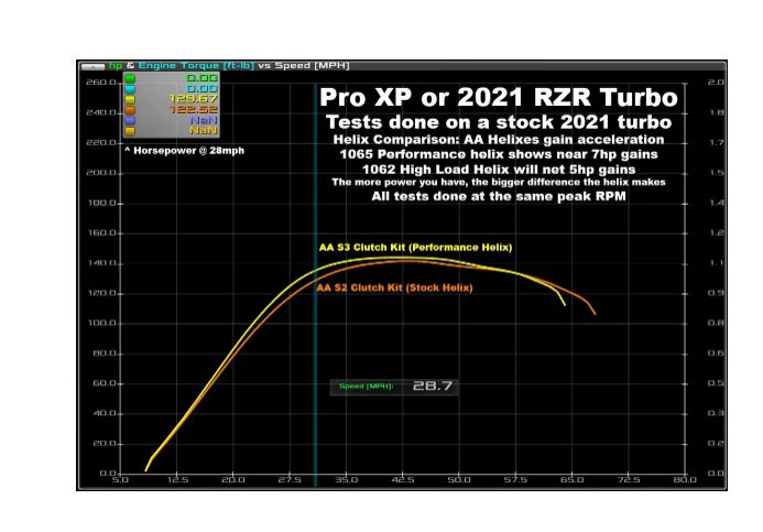- High Load Helix 1062: Slightly less aggressive than the performance helix with good acceleration gains/power transfer over the OEM helix. Designed to work better for heavier vehicles, heavier tires, heavy sand load or crawling type riding in mind. Works on Turbo R 2 & 4 seat models with 32-35" tires or 30-33" paddles. Excellent all around helix for any Pro XP or Turbo R!