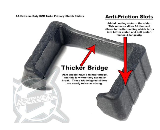 - This kit includes our complete heavy duty AA primary clutch. This clutch is the same design found on the 2016-2020 RZR Turbo models with an encapsulated tower design. We found this clutch to hold power better, hold up better (no exploding), and slip the belt less. It simply meets the demands of these high horsepower vehicles, and is proven. This clutch also holds belt grip better than billet clutches, especially when clutching for higher RPM. This primary clutch is our own version made with higher grade tool steel for the post, assembled with AA HD sliders, to our AA specifications.
