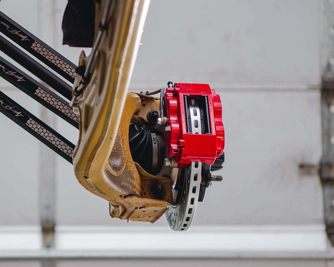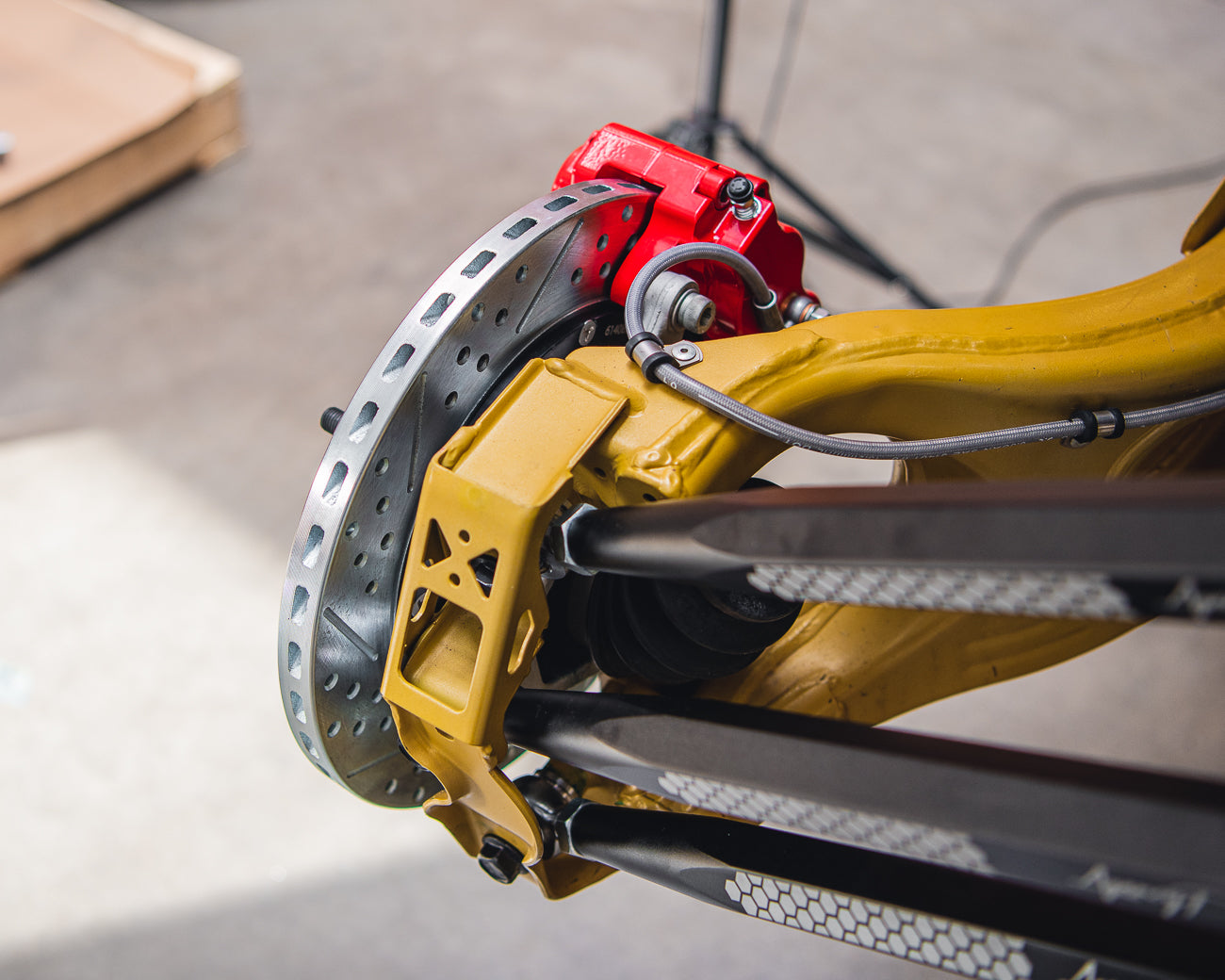 Brake pads for the 4 wheel kit were chosen to provide the optimal performance for the majority of users. With the focus on balance, getting the right friction for the front and rear was important for this setup. The front caliper uses a Hawk HP+ N-Compound while the rear uses a DR1-C ceramic brake pad. Once bed-in properly, the brakes will provide amazing performance without excess squeaking noise. The brake pads are a common shape which allows for ease to access replacement pads. An extremely important part of the big brake kit is the rotors. We utilize a 2 piece cast iron brake rotor just like you would see on high performance car brakes. Cast iron dissipates heat much better than steel like the factory style. Steel will hotspot and throw heat back into the caliper making fluid boil and cause pedal inconsistencies. Cast iron also has a higher coefficient of friction compared to the single thin stamped steel rotor. Each rotor is vented, slotted, and cross drilled. Because the rotors are also directional, while the rotor is spinning, it acts like a pump to cool the brake down. With the rotors larger diameter, this increases torque and leverage of the brake. Since brakes are essentially a heat sink, the better and more accurately we can dissipate heat, the better the brake will perform.