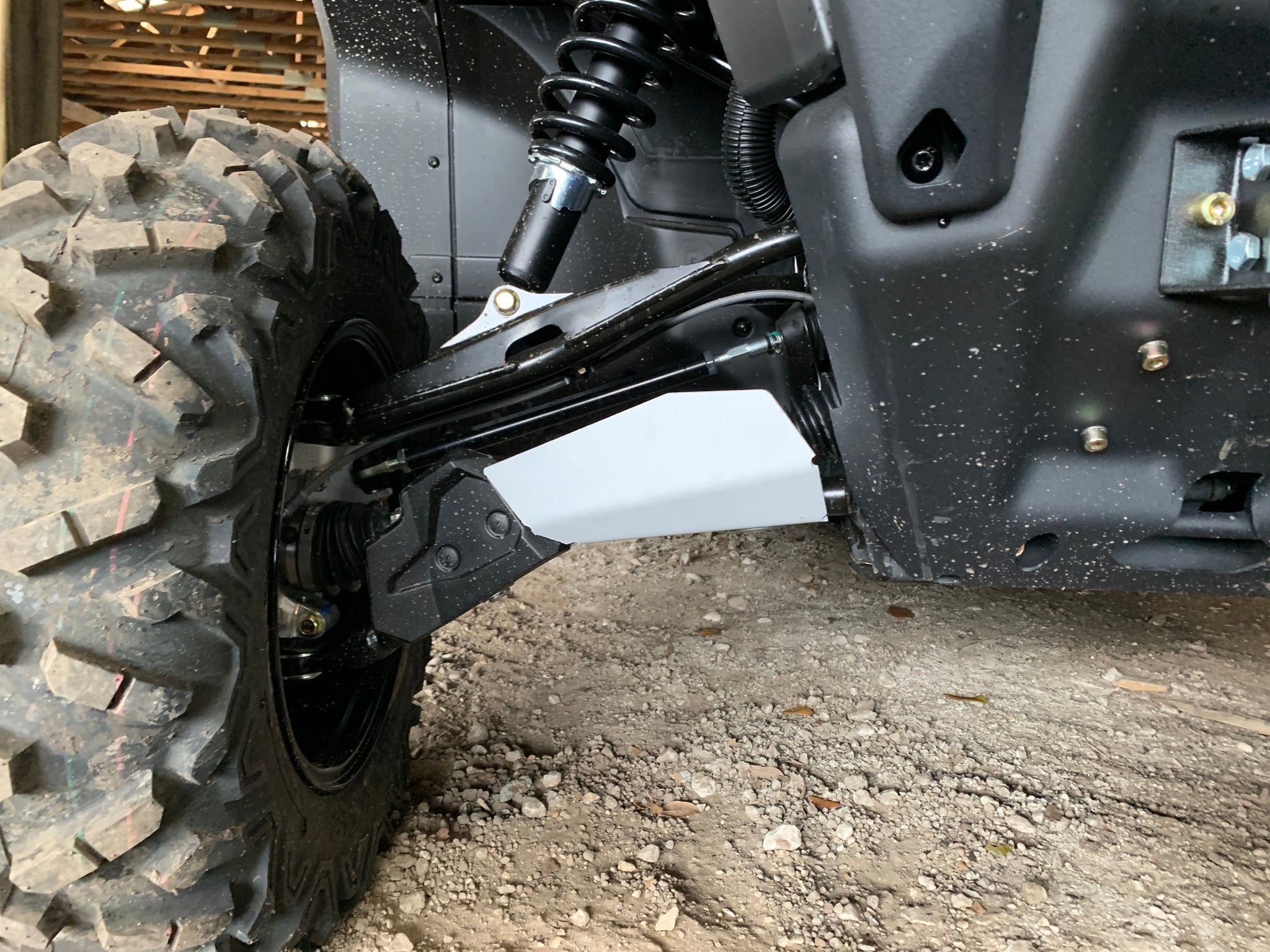 One of the most vulnerable and less protected part of your Can Am Defender are your A arms and CV joints. But you can protect both with our 3/16" Marine grade Aluminum A Arm Protectors. With a high folded front edge that protects your A Arms from impact and your CV Boots from sticks hitting and tearing and letting dirt in there to wreck the joints. We also have drain holes on the underside to let dirt, grass seed and sand that has built up to fall out or to be washed out. Our A Arm Guards utilise both factory mounting points and steel brackets to give maximum strength when mounting. We also use a stamping procedure to allow extra strength for the A Arm Guard and for our high strength bolts to be recessed to allow a flat surface for sliding over any obstacle you might come across on the trail. PART NUMBER ONLY INCLUDES FRONT A ARM GUARDS