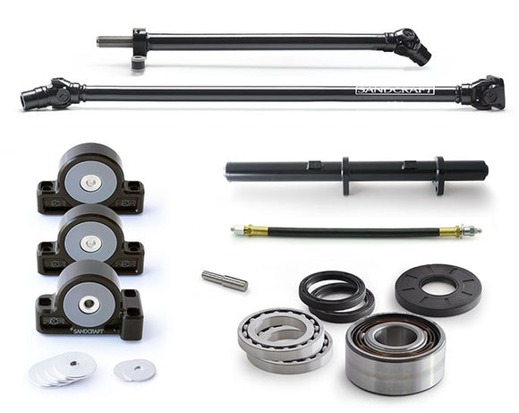 This SANDCRAFT kit is the only complete solution to the RZR’s drivetrain issues and failures. Our patented carrier bearing/driveline combo to strengthen and straighten the driveline, a front differential bearing and seal kit to smooth out and quiet down an angry diff, a motor mount kit for reinforcement of the rear end and a grease whip to make maintenance quick and easy. This kit has it all.
