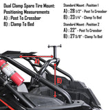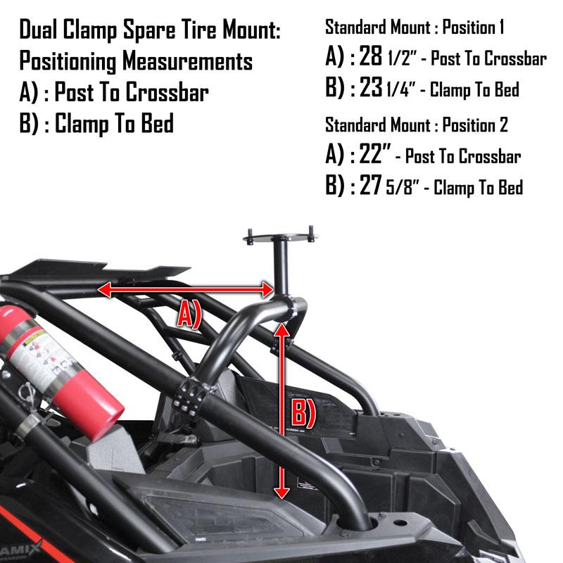This Dual Mount spare tire carrier allows you to easily mount a spare tire to your roll cage. The dual clamp kit is extra strong and allows positioning of the rear tire, while also allowing 23 vertical inches of storage clearance. Built from thick .120″ wall Steel tubing and powder-coated for a tough beautiful finish. This dual clamp mount allows you to carry a spare tire and maintain your bed storage space for Ice chest, tools and provides as a ample platform for other mounted whips and accessories. Don’t get stranded out on the trail, carry a spare tire!