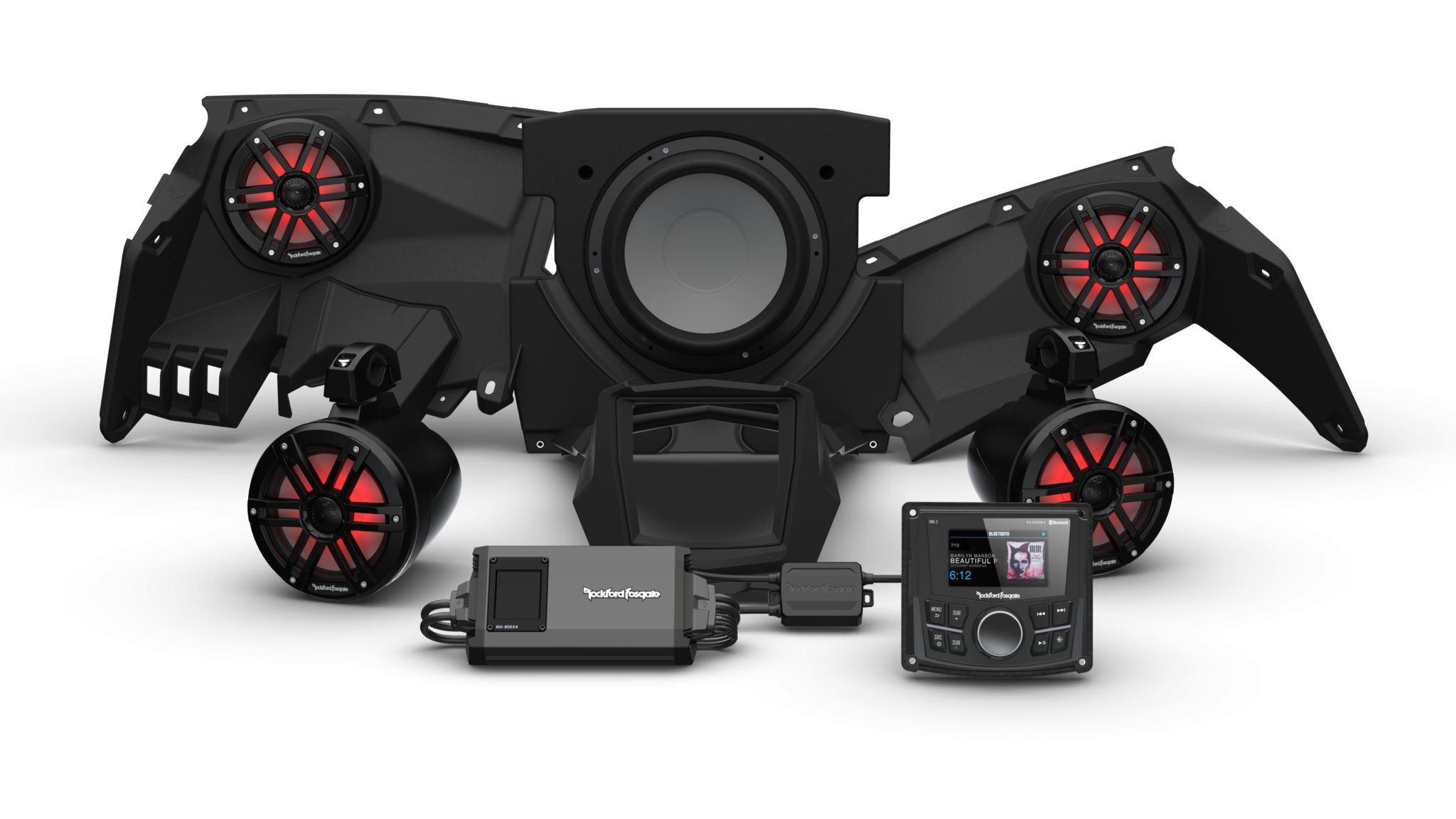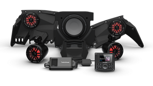 This Rockford Fosgate audio kit is Color Optix™ enabled by featuring our Color Optix™ controller to allow color adjustment of speakers and rear moto-cans. Audio system is 100% Element Ready™ solution and provides ability to take your off-road vehicle into any environment. Amplifier employs Rockford Fosgate preset for easy set up allowing maximum performance without any tuning. System features a plug and play design, does not require any cutting with minimal drilling of vehicle, step by step install videos available.