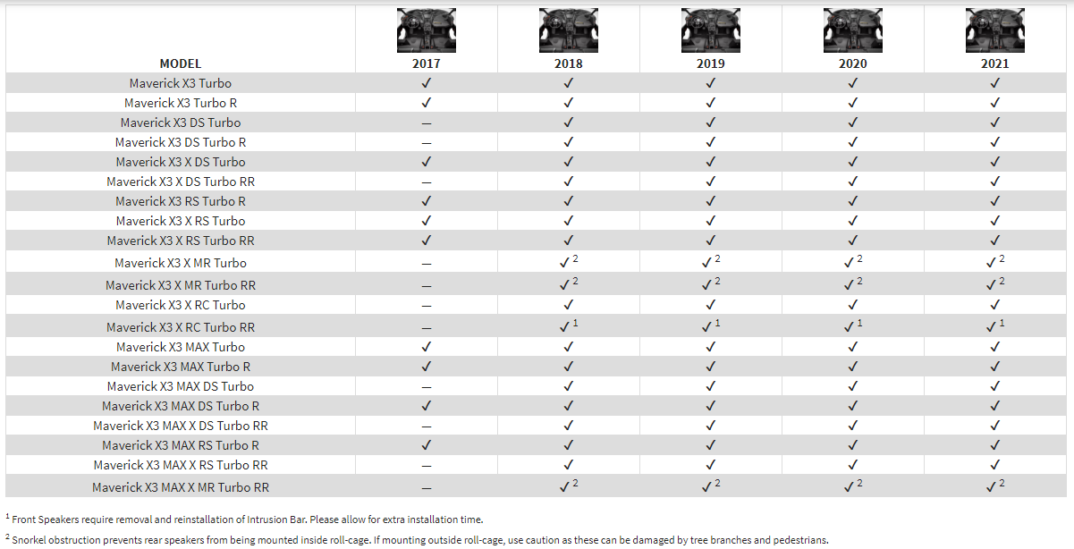 Our Gen-3 Stage 4 lets you hit the dunes and trails and make an impact! System allows you to add front and rear Color Optix™ speakers and a subwoofer on select Maverick X3 models. Kit is equipped with a PMX-2 digital media receiver, upper dash kit, front speaker panels, M1 6.5” Color Optix™ speakers, 800-watt Element Ready™ amplifier, under-seat front subwoofer enclosure, M1 10” Element Ready™ subwoofer, 8-gauge wiring harness, M1 6.5” Color Optix™ moto-cans with harness, and a Color Optix™ controller. Kit supplied with all necessary mounting and installation hardware requiring minimal time and tools. Refer to our COMPATIBILITY chart to verify fitment before purchasing.
