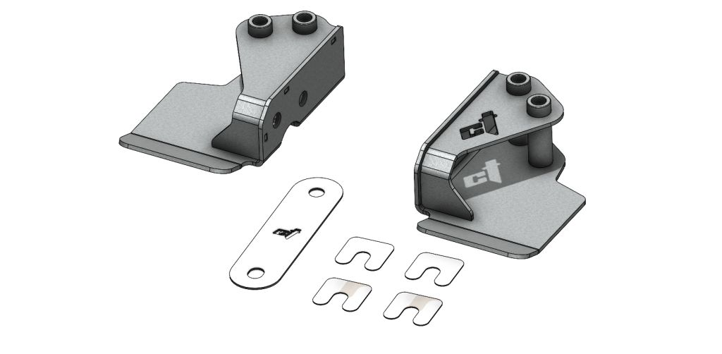 We have also added stainless steel shims to each side of the OEM mounting brackets that are welded to the chassis. When these chassis are built, the welding is causing the brackets to bow. After comparing several different chassis we have found the brackets to bow more than 1/8" on some chassis so we created a shim kit that should work well with all combinations. By adding the shims, the brackets aren't being drawn back in when bolting the diff in, they are in a more relaxed position and aren't under any stress which will help with the cracking of the factory welded in brackets.