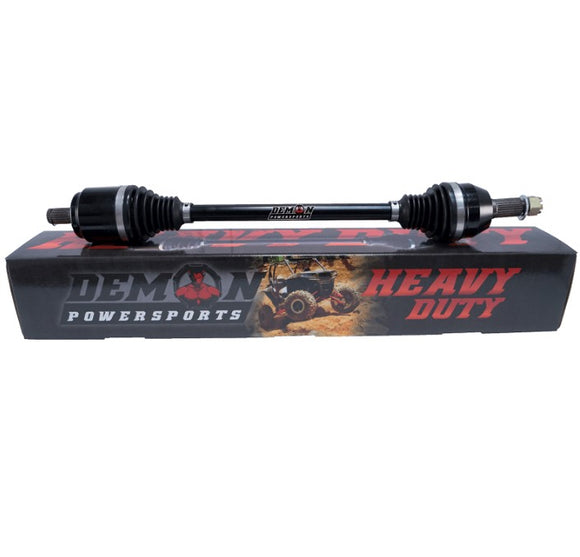 Heavy Duty Axle by Demon Powersports®. This top-grade product is expertly made in compliance with stringent industry standards to offer a fusion of a well-balanced design and high level of craftsmanship. Manufactured from industry-leading materials using up-to-date equipment, it ensures everlasting reliability and enduring value. This product is distinguished by total quality assurance, unsurpassed by anybody else. Dual Heat Treated chromoly steel holds up better through extreme torque, wide articulation angles and an increase in plunge prevents the axle from binding, thermoplastic Polyester Elastomer CV boots are highly resistant to tearing, this method provides best overall operating performance