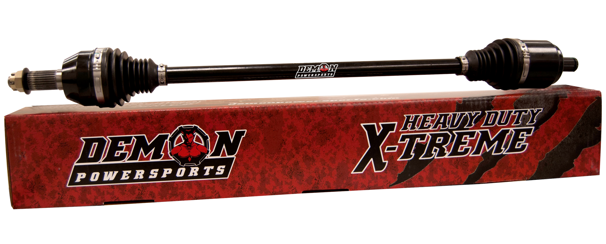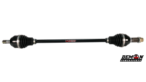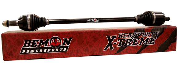 X-Treme Heavy Duty Axle by Demon Powersports®. This top-grade product is expertly made in compliance with stringent industry standards to offer a fusion of a well-balanced design and high level of craftsmanship. Manufactured from industry-leading materials using up-to-date equipment, it ensures everlasting reliability and enduring value. This product is distinguished by total quality assurance, unsurpassed by anybody else. Complete Axle 4340 chromoly steel, larger CV Joints and center shaft diameters, re-engineered cage design to enhance durability, thermoplastic polyester elastomer CV Boots are highly resistant to tearing