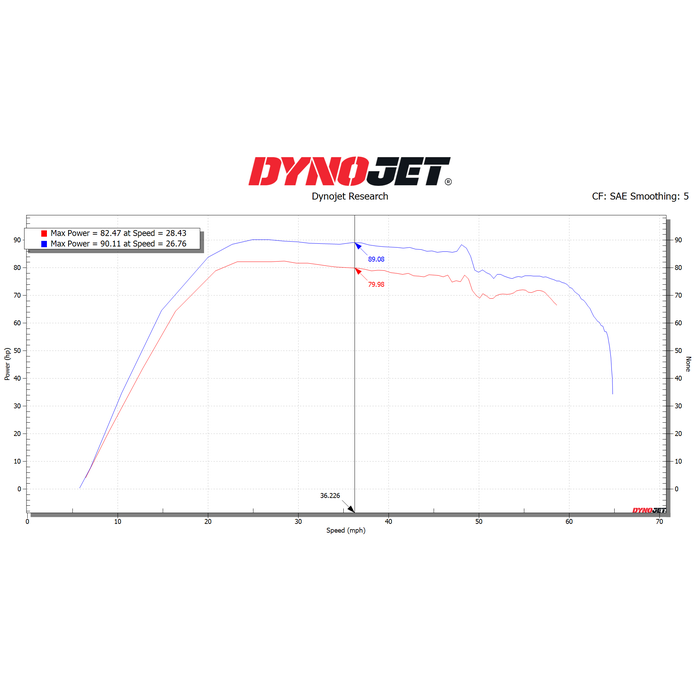 Stock (red) vs. PV3 tuned (blue) results from Dynojet in-house dynamometer