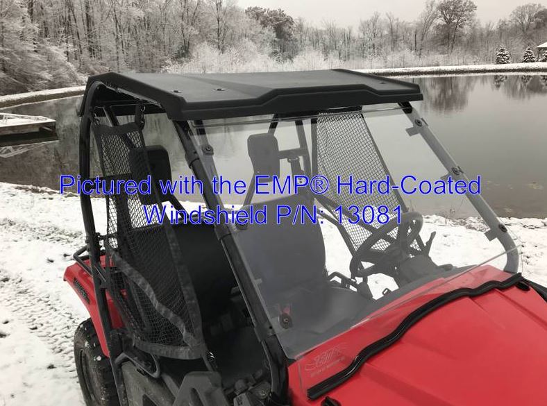 Honda Pioneer Polyethylene Top P/N: 13747 Fits: 2015-2023 Honda Pioneer 500 and 2021-23 Pioneer 520 Thermo-formed from .188 thick Polyethylene (starting thickness). Protects from the rain and sun. Front, rear and side gutters divert water. Will work with most windshields including EMP® P/N: 13081 Hard Coated Windshield and the Factory Flip Out Windshield Honda P/N: 08R74-HL5-A01. Honda Pioneer 500 Hard Coat Windshield P/N: EMP®-13081 Fits: 2015-21 Honda Pioneer 500 and 2021 Pioneer 520 (Note: when installing on the 520 it is tight fit behind the dump bed. The bed will slightly rub on the cab back when the bed starts to dump) 3/16” Thick Hard Coated Polycarbonate. Attaches with our patent pending rubber "Fast Straps". Virtually, unbreakable under normal use. Rubber mounting straps will not rust or rattle. Bottom seal protects your hood. DOT-rated and stamped. Honda Pioneer 500 Hard Coat Polycarbonate Cab Back/Dust Stopper P/N: EMP®-13861 Fits: 2015-21 Honda Pioneer 500 and 2021 Pioneer 520 (Note: when installing on the 520 it is tight fit behind the dump bed. The bed will slightly rub on the cab back when the bed starts to dump) 1/8” Thick Hard Coated Polycarbonate. Attaches with our patent pending rubber "Fast Straps". Virtually, unbreakable under normal use. Rubber mounting straps will not rust or rattle. Cut, bent and packaged in Cleveland Ohio.