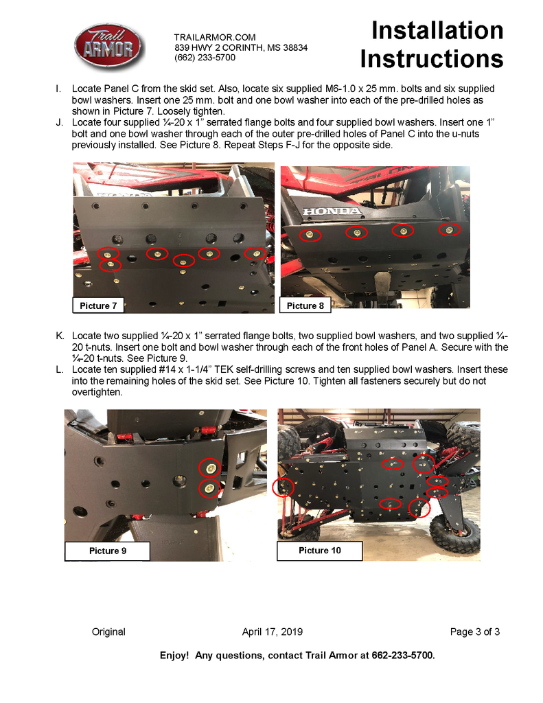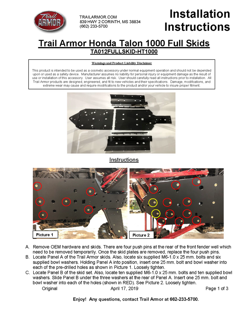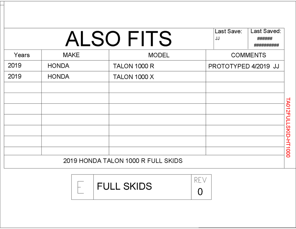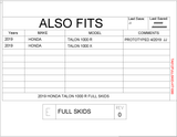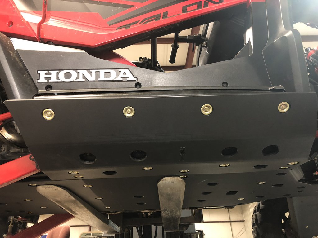 Get the best in under vehicle protection with Trail Armor's full skid plate set for the 2019 Honda Talon 1000R and 1000X. Made from our own custom blend of ultra high molecular weight polymer, these 1/2" plastic skids are lighter than most traditional metal/aluminum skid plates (see specs below) and because they have no "impact memory", they absorb shocks to the bottom of your vehicle without the dents, galling and corrosion of metal/aluminum skids. Trail Armor was the first in the industry to design skids with the formed front leading edges featured on our skid plates. These leading edges protect vulnerable frame edges and wheel wells from blunt edge impacts and act as a starting edge to slide over obstacles without the resistance and drag of metal skid plates. Additionally, these Trail Armor skids for the Honda Talon 1000 are designed with extended side skid plates that help protect the vulnerable side panels of your vehicle. Compare Trail Armor's skid set coverage with other skid manufacturer's like items - side skid plates are either sold separately or the bottom skid coverage ends at the factory mounting holes for OEM skids, leaving this part of your vehicle completely unprotected. Trail Armor's skid plates come in easy to install panels that cover the full length and breadth of the vehicle, including the front and rear differential. Access holes to service points and oil drains make maintenance a breeze. Strategically placed drain holes allow dirt and debris to wash out - you don't have to remove them to clean out the belly your vehicle. However, if needed, individual panels may be removed to access different areas without removing the entire skid plate. Recessed mounting holes protect fasteners from damaging blows and keeping all bolt heads from protruding the skid's surface. All kits come with corrosion resistant hardware and photo-documented installation instructions. Installation videos, if available, are provided as a YouTube video on our site. Note: Any Trail Armor a-arm guards shown installed on vehicle in pictures are sold separately and are not included as part of this skid plate set. Shipping weight - skid set 46 lbs centers and 27 lbs sliders Flat 4x8 sheet Aluminum 5052 piece weight, gauge .25: 111.744 lbs Flat 4x8 sheet UHMW piece weight, gauge .5: 79.2576 lbsSource: http://www.onlinemetals.com