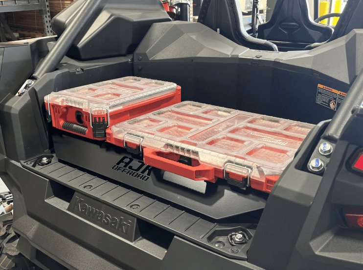 200492Our Kawasaki KRX Milwaukee Packout Mount is the perfect storage solution and is fully compatible with machines equipped with the factory-installed subwoofer. Each mount is CNC laser-cut in-house from 10-gauge P.O. steel and finished with a durable black powder coat. Installation is simple—using existing bed holes, so no drilling is required. Just remove four bolts, reuse two of them, and replace the other two with the supplied hardware.
