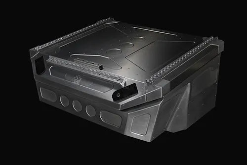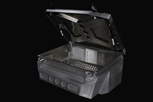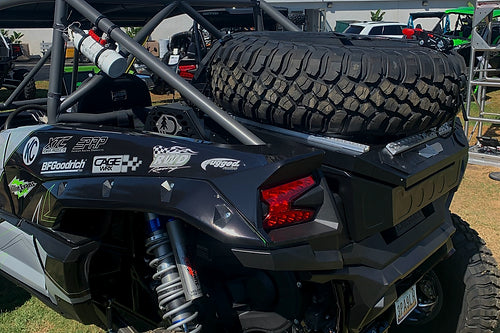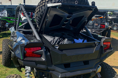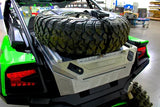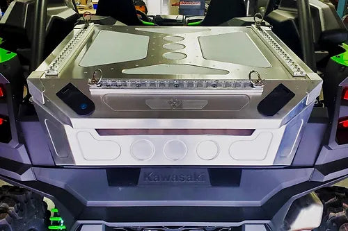 Sealed locking aluminum storage box and spare tire carrier built around the Kawasaki Teryx KRX 1000 platform. Gas struts weighted to 65lbs for the spare tire allow easy access into the weather proof storage area which is designed to prevent entry of any water or dust you may kick up on the trail. Dividers are included for organization of the interior separating spare parts from daily essentials.