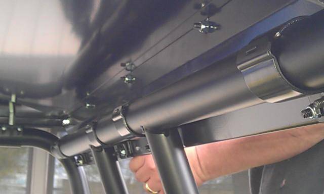 Made from 16 gauge steel and powder coated. The sides are hemmed over twice, creating a strong 1/8" angle around the outside edges. Can be used with most aftermarket windshields and the EMP cab back. Protects the driver and all passengers from rain, snow, etc.
