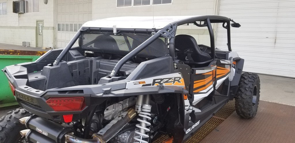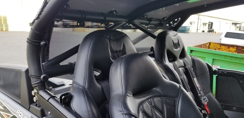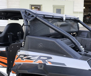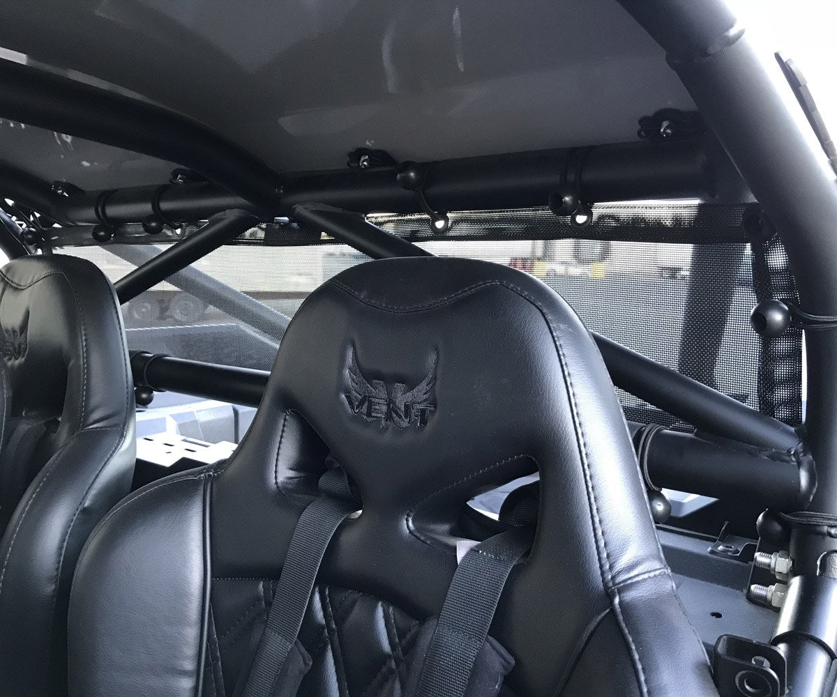 MotoRoof Wind Jammer is a mesh dust barrier designed to quickly attach to your 2014 and newer Polaris 4 seat Vent Racing cages. These are designed specifically for the Vent Racing Coupe, FastBack, and Trucker Cage Models. The Wind Jammer is an excellent quick attach barrier that helps to greatly reduces dust rolling back into the cab of your vehicle. You also gain an additional 80 percent shade factor for the rear of the vehicle.