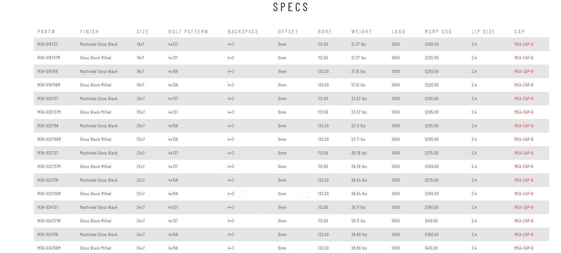 - M36-024737M - Gloss Black Milled (24x7 / 4x137 / 0mm)
