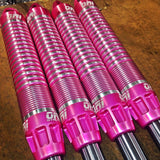 Built with the racer and tuner in mind. The integral reservoirs give the struts an additional 24 position knob on the reservoir for compression tuning, progressive 4 stage compression valving, and features deep cooling fins on both the strut body and the reservoir for greatly improved heat dissipation. The Integral reservoirs also give the struts a greatly increased oil and nitrogen volume that softens the spring rate and gives the struts more compression oil for big hits. This model is available assembled or in a kit version from the factory.