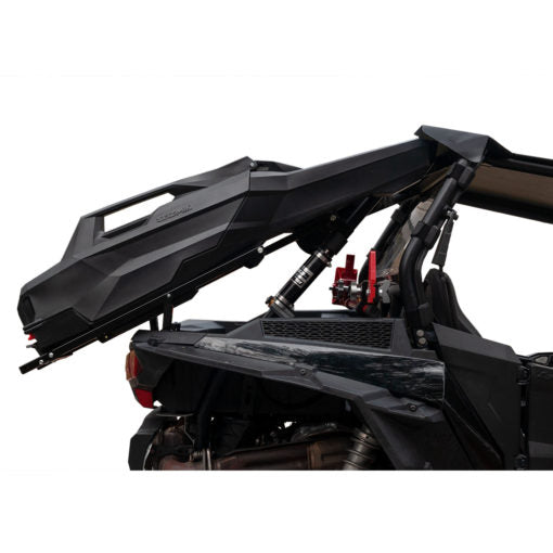 The Armory R1 Rack works in tandem with the Armory SST gun case to store and transport a weapon (requires one Armory SST case and one Armory R1 Rack). The design of the system positions the case over the rear roof line of the RZR. With the case locked in place on the rack, the gun is always pointed up and away for superior muzzle control.