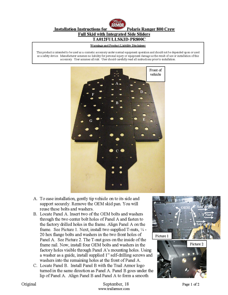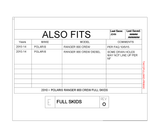 Get the best in under vehicle protection with Trail Armor's full skid plate set for the Polaris Ranger 800 Crew. Made from 1/2" high density uhmw polymer, these , including the front and rear differential. plastic skids absorb shock to the bottom of the vehicle with no dents or rust and are lighter than traditional metal skids. Strategically placed drain holes allow dirt and debris to wash out - you don't have to remove them to clean out the belly your vehicle. They come in easy to install jointed sections that cover the full length and breadth of the vehicle. Extended side panels serve as nerf sliders protecting the sides and rocker panels of your vehicle. Mounting hardware and instructions included. Fits Year Models 2010 through 2014.