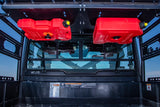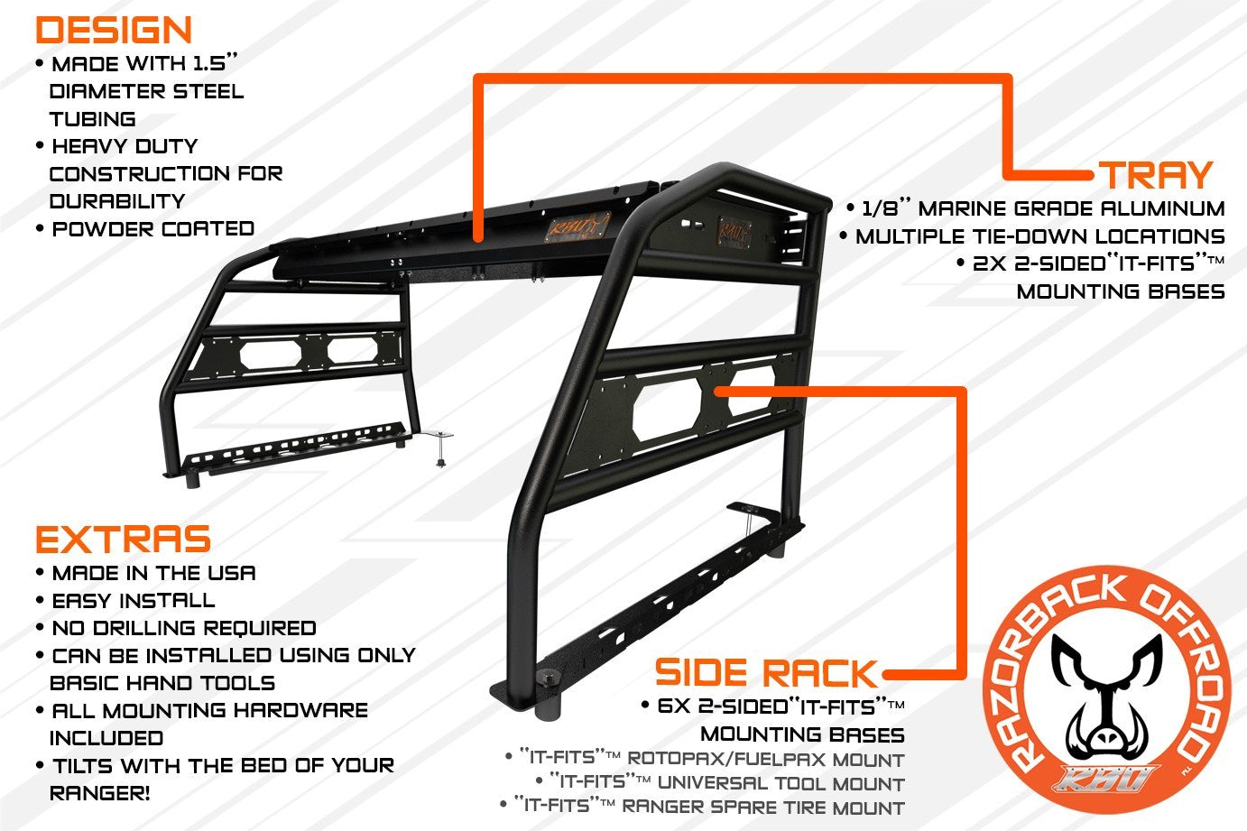 The Polaris Ranger Utility Cargo Rack by Razorback Offroad has unlimited uses. For those of you who want a Polaris Ranger Duck hunting rack or Deer hunting rack we got you covered. The Upper Cargo Tray is large enough to carry your decoys, coolers, etc. and gives you room in the bed for your dogs. When it comes to the versatility for your Polaris Ranger around the Farm, it doesn’t get any better than our Polaris Ranger rear bed Storage rack. We have given you 72 total Tie Down slots where you can secure a Bungee or piece of rope to tie your cargo down to our Ranger Rack. We also know how important it is to have your shovel and other tools with you no matter where you are. That’s why we have made 16 different mounting options for our “It Fits” ™ Accessories mounts. Never before has a Polaris Ranger Cargo rack offered so many options for mounting and securing, fuel cans, coolers, RotoPaX, FuelPaX, shovels, hammers, ropes, chainsaws, wood, rafts, etc. the list just goes on and on. Just imagine how organized you can be on the trail, job site or farm with so many options for mounting your UTV accessories. We also offer an optional spare tire mount that has 2 different mounting options inside of the bed and holds most sizes of tires. When it comes to securing items in the bed of your Polaris Ranger we made it simple by building 16 tie-down points into the Polaris Ranger Bed Rails. These rails are an integrated part of the Ranger rack so they have the strength to keep cargo in its place. This is one tough Polaris Ranger Storage rack. We built the sides from 1.5” steel tubing and then powder coated them in our Tuff Coat Black Finish. The upper Cargo Tray is made from 1/8” thick military-grade aluminum and has an inside dimension of 18-3/4” deep x 52” wide and 4” Tall with 48 tie-down slots so you can tie down about anything.