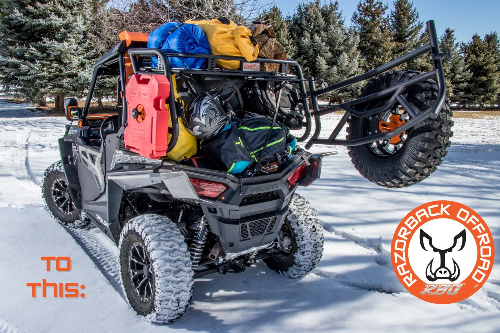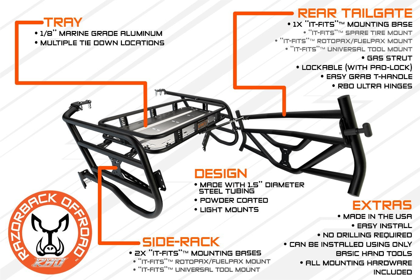 The RBO Expedition Rack™ is made from 1.5” Diameter Steel Tubing. It has a rugged powder-coated finish and is manufactured right here in IDAHO. The removable Tailgate can be locked with a Pad-Lock and has a gas strut to hold the tailgate open. The Expedition Rack also has our “It Fits” ™ RBO Mounting system. With the “It Fits” ™ mounting system you can quickly and easily install any RBO accessory with the “It Fits” ™ icon. This rack comes with everything you need to install it on your machine without drilling or modifying your machine. When it comes to satisfaction, we believe in backing up our products. That’s why we offer a 30 day money-back guarantee*. Experience today why so many people are installing a RBO Cargo Rack on their Polaris RZR’s.