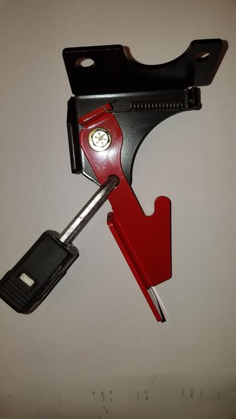 To operate, depress brake pedal with right foot, slide lever over brake pedal arm with your left foot and the SBT engages all 4 brakes. Once set, add your own pad lock (1/4" to 5/16" shaft) for that extra security. To release simply unlock pad lock, remove, and depress brake pedal.