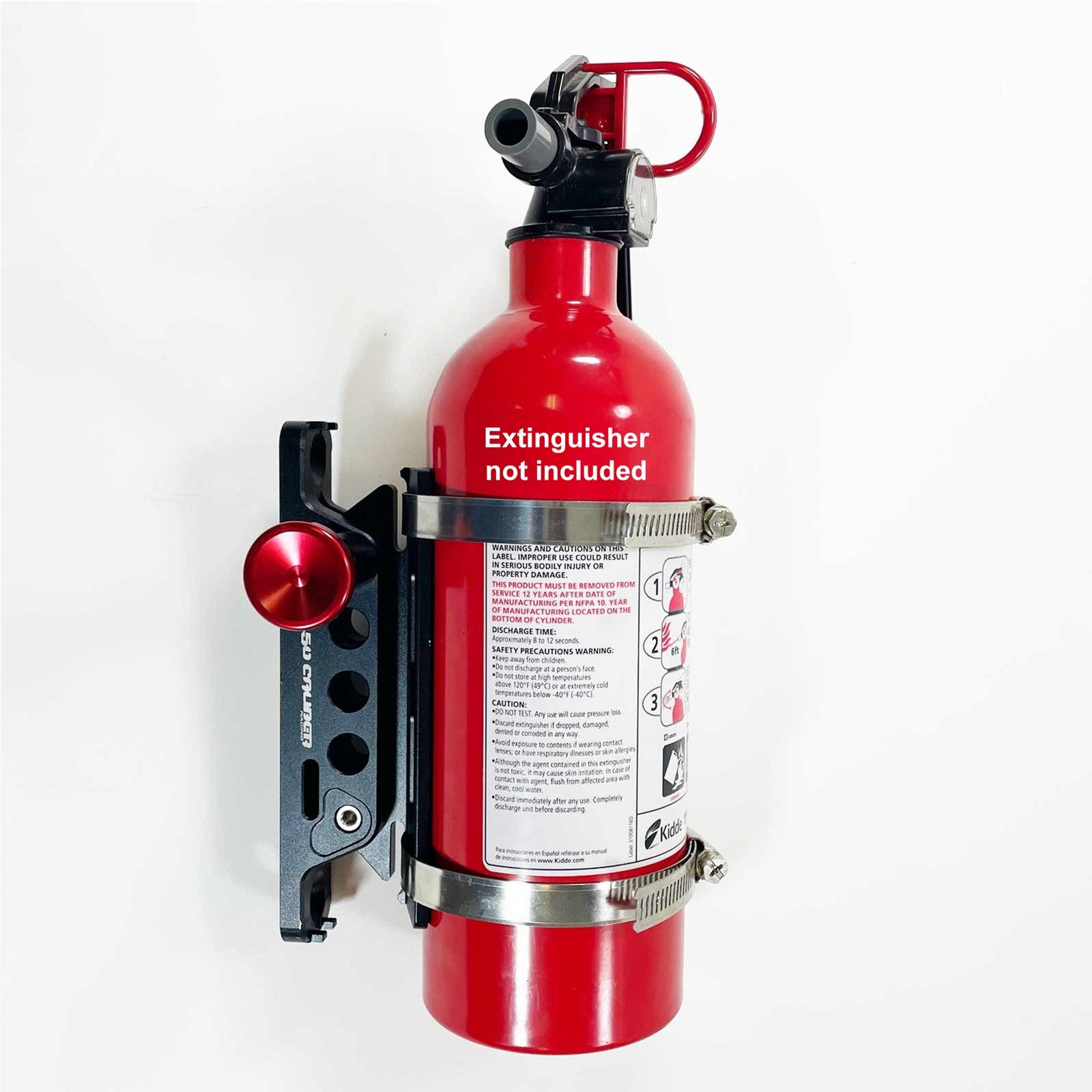50 Caliber Racing Quick Release Fire Extinguisher Mount . Two piece design with stainless hardware and multiple points of contact for rattle free reliable performance. Stainless catch pins resist corrosion. Just pull the large red knob to release, and your extinguisher is ready to use. Mounts directly to any size roll bar, or can be bolted down to any surface. Works great with most 3-3.5" diameter bottles (extinguisher not included). You never know what can happen when your out riding the trails or on the streets. One unforeseen emergency can be a disaster without the right equipment available. Our quick release fire extinguisher mount is a must have for any off road trip. Two piece design with stainless hardware and multiple points of contact for rattle free reliable performance. Stainless catch pins resist corrosion. Just pull the large red knob to release, and your extinguisher is ready to use. Mounts directly to any size roll bar using the included stainless clamps, or can be bolted down to any surface. Add some safety to any vehicle: UTVs, 4x4s, rock crawler, sand rail, or even your daily driver. Works great with most 3-3.5" diameter bottles (extinguisher not included). Features: - CNC 6061 Aluminum construction - 6 contact point design - Large red anodized release knob, easy to see and operate with gloves on - Stainless catch pins, resistant to corrosion and seizing - Black Powder coat finish - Soft backing protects mount surface - Mounts to roll cage or other surface - Includes 4 stainless steel clamps - Please note: Fire extinguisher not included Give your self some peace of mind, install one in all your vehicles: - UTV and Side by Side (RZR, Maverick X3, Teryx, Talon, Ranger, Rhino, YXZ1000R, Wildcat) - Sand Rail - Dune Buggy - 4x4 or J**p - Rock Crawler - Race Car - Demolition Derby - Daily driver