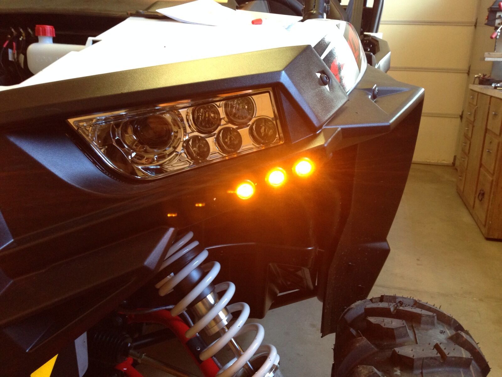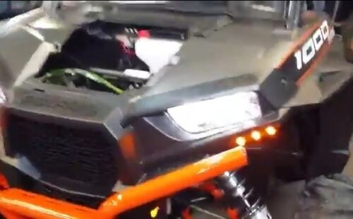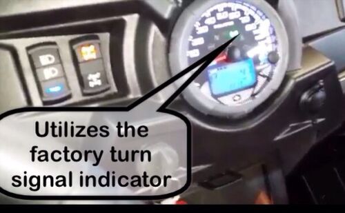 Ryco street legal kits have a turn signal with an integrated horn button and emergency flashers. The Ryco kit interfaces with the gauge pod in most UTVs to show when the turn signal is actuated. On the Polaris digital dash a green light flashes on each side of the dash to indicate when the signal is actuated for left or right. Some 2019 models may require separate led turn signals to be installed that are provided in the kit. The analog dash has one green (<>) light in the middle that flashes.