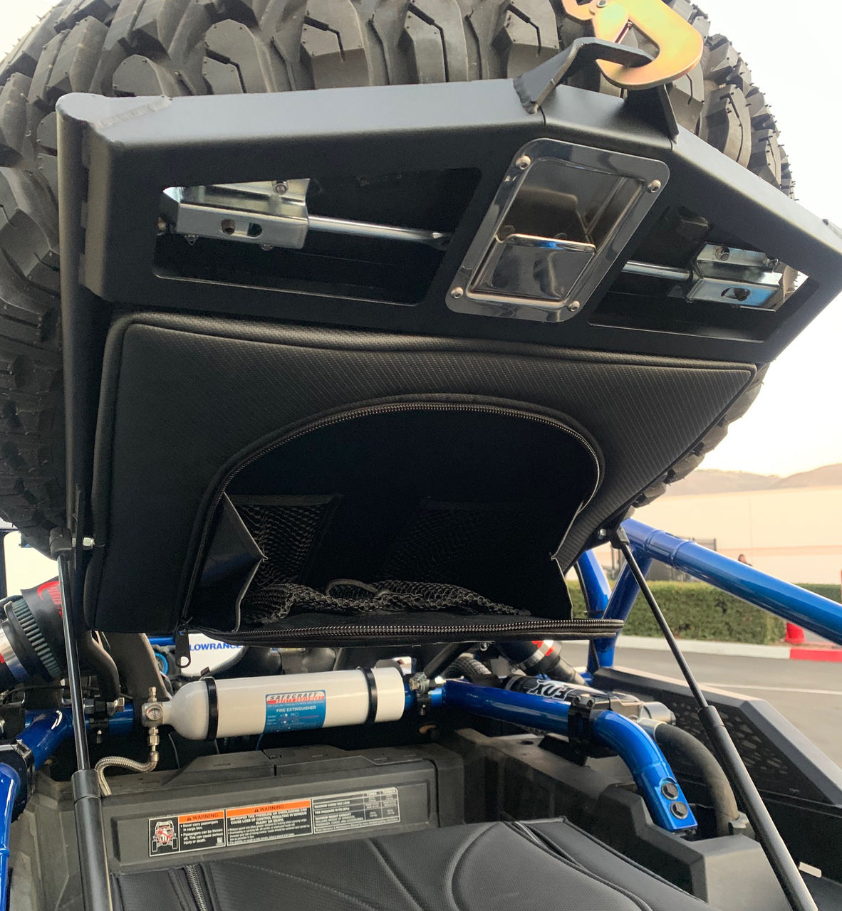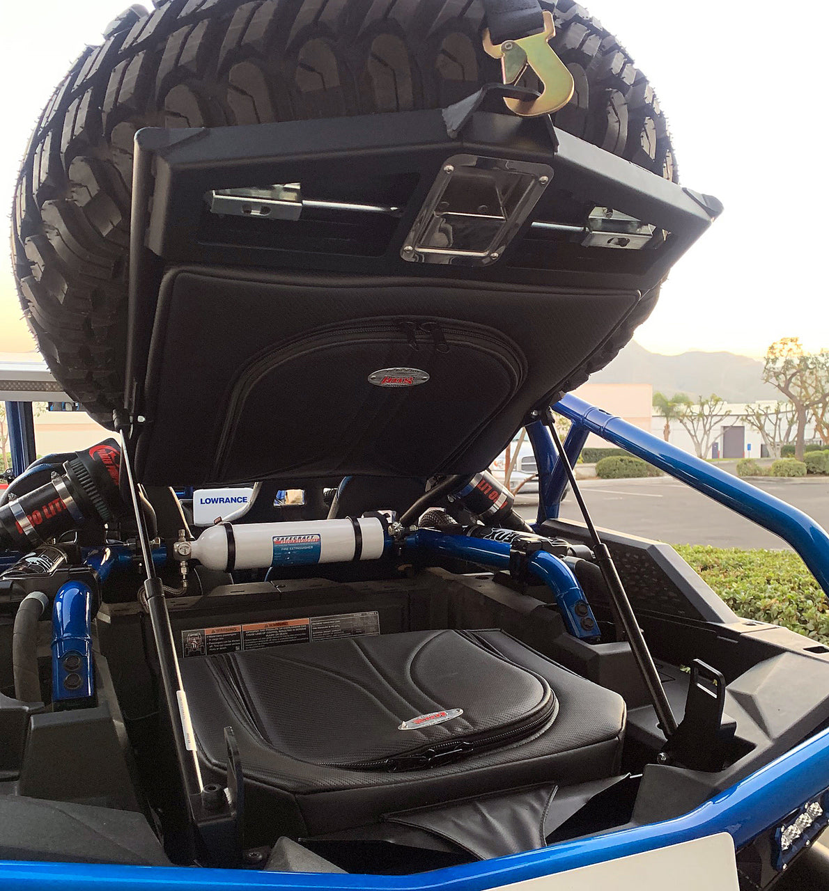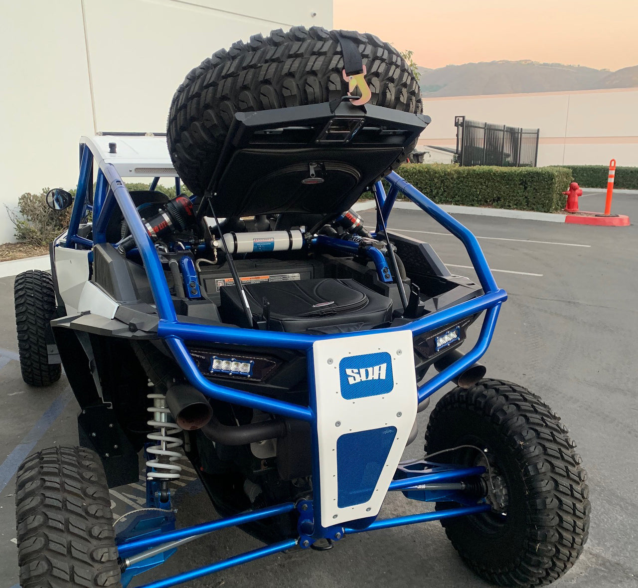 FITS UP TO A 35 SPARE WITH STOCK CAGE, SDR PRE-RUNNER CAGE, SDR SHORTY CAGE. AND MOST CAGES WITHOUT A REAR BUMPER