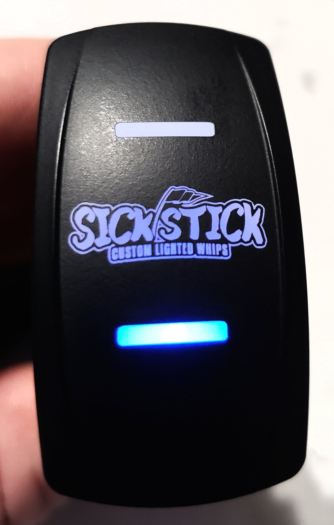 Our laser etched rocker switch kit makes your Sick-Stick lighted whip wiring easy and adds that custom look to your machine. This switch kit is designed for those that are Hardwiring the Sick-Stick lighted whips and allows the whips to run between 2 different colored lights. The ON-OFF-ON rocker switch is currently available with a Red & Blue light bar. For example, if you wired the switch to run your whips red and blue you would push the switch one direction for red and the opposite direction for blue. ON(red)-OFF-ON(blue). The provided switch harness fits most popular SXS's and has 5' of wiring that routes from the switch to your 12v power/ground supply. Such as the power/ground bussbar under the hood of CanAms and Polaris or the battery area of the YXZ and many others. Our switch harness has 12' of wiring that routes from the rocker switch to your Sick-Stick lighted whips. With this length it is long enought to fit 2 seater & 4 seater SXS's and Sandrails, etc. We know wiring and cut no corners on our products. All the wiring in our harness is nylon wrapped & connectors are properly crimped and fitted in the switch hardshell. This switch kit can only be used with the hardwire whip set-ups. If you already have our Sick-Stick's, you can also use this switch kit in conjunction with the Hardwire cable kit to convert your Remote Control VooDoo or Kozmo whips to eliminate the remote and only run your whips in 2 solid colors. Please note, not all whip light color combos are compatibale. We now offer a jumper harness to allow you to run white and most color combos. Please message us when ordering what light colors you wish to run on your whip so we can include the appropriate instructions & jumper harness if needed.