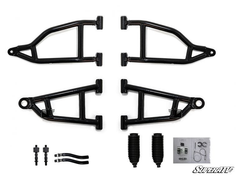 This A-arms kit comes complete with all new UHMW bushings preinstalled and a heavy-duty Z-bend tie rod kit with inner tie rod ends and boots. It’s the complete package and the complete upgrade to make your Mule Pro a monster. UHMW bushings wear less so you can ride more, and our heavy-duty tie rod kit makes sure you’re in control riding through miles of rough terrain. This kit is Built for Battle.
