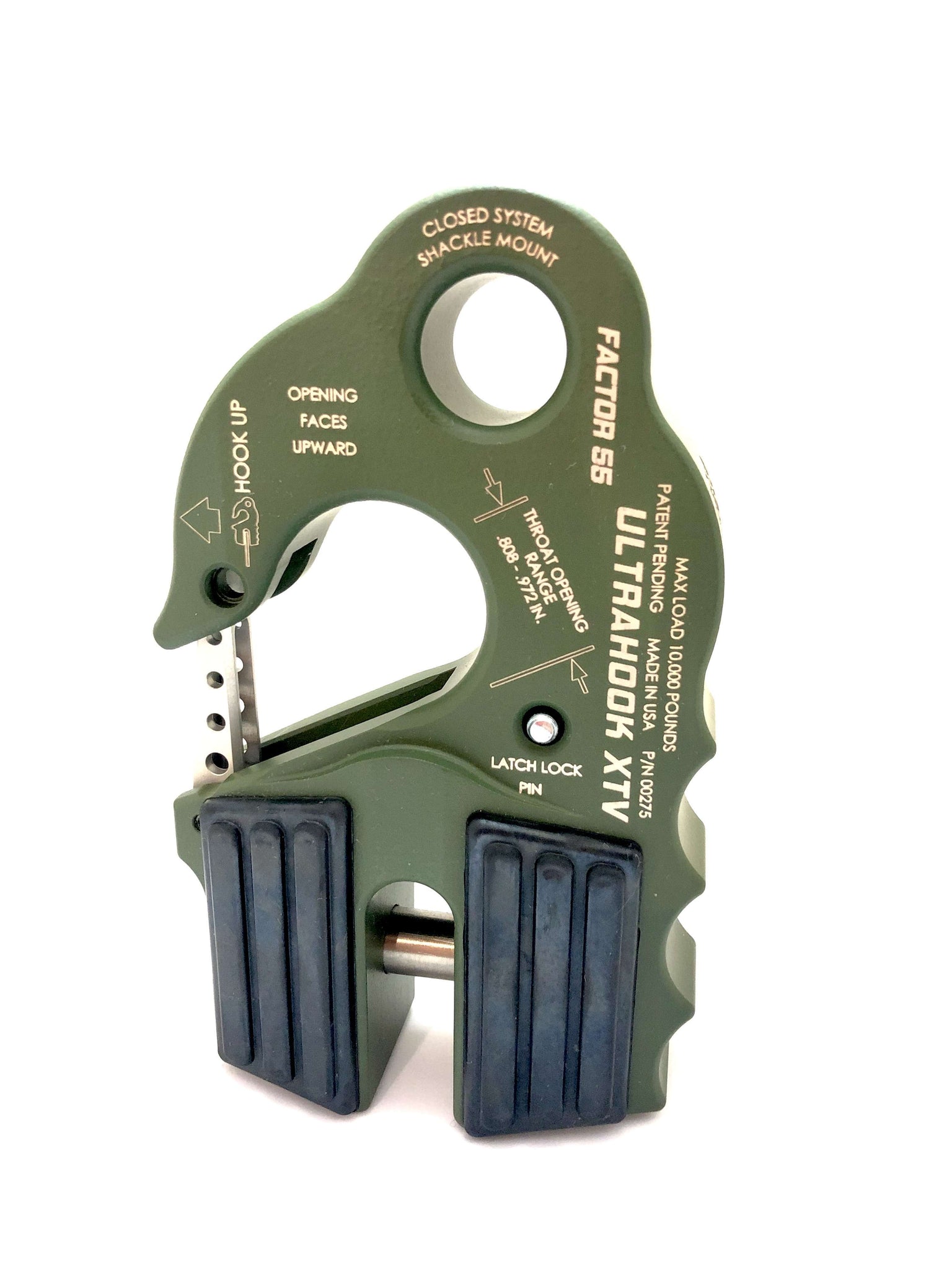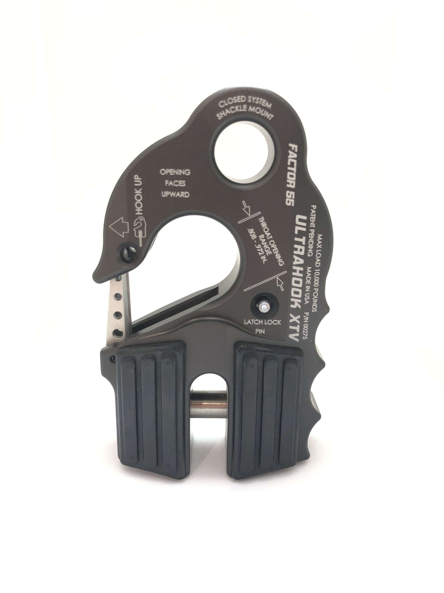 The world’s safest UTV/ATV winch hook. Featuring Industry first Closed System Shackle Mount hole machined into the body of the hook, safety latch retraction pocket resulting in a clear throat opening, integrated secondary safety latch locking feature-latch locking pin stored in the body of the UltraHook XTV which can be removed and inserted in to the hook tip, locking the latch into place. EPDM rubber pads for fairlead protection, titanium double shear pin, and a finger grip feature that promotes proper “Hook Up” orientation. The first winch hook that can be stored against your fairlead protecting either your hawse or roller style fairlead from a metal to metal connection.