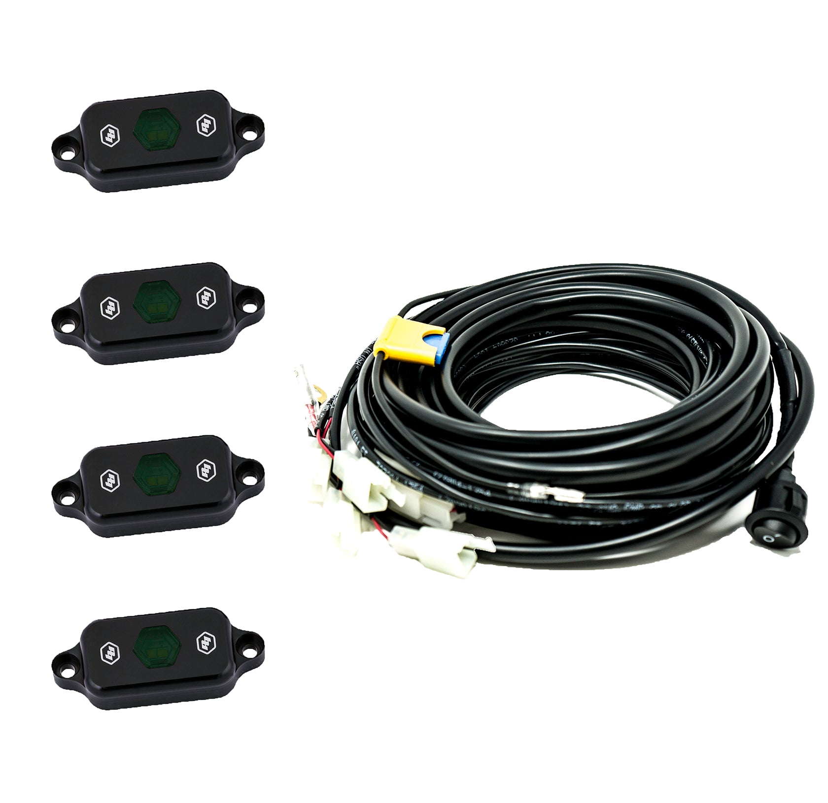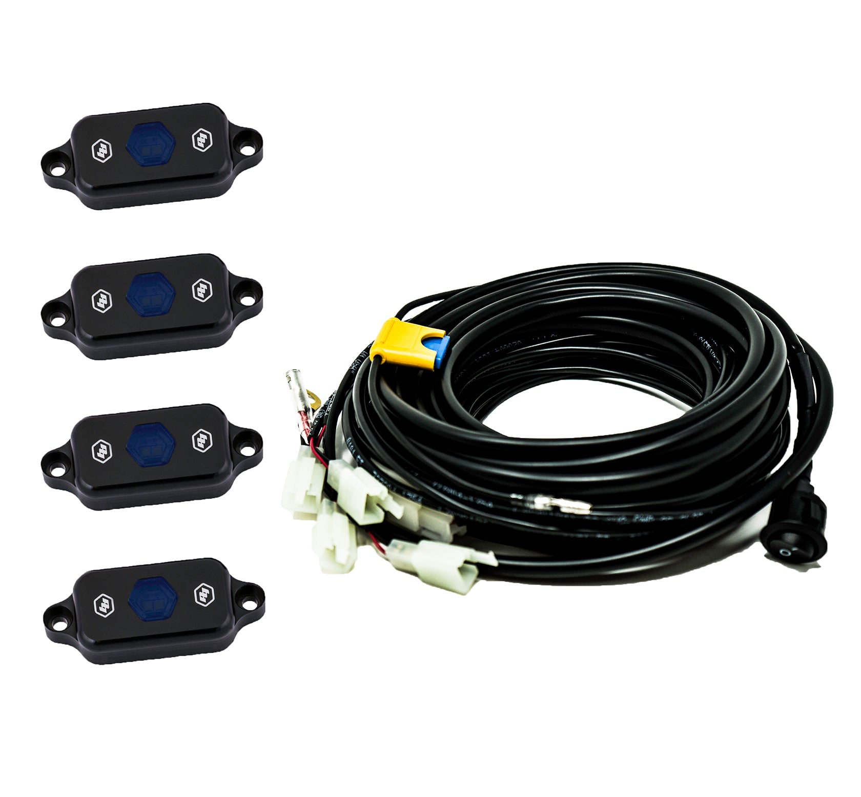 Our Universal Rock Light Kit takes the guess work out of buying wiring and trying to figure out how to pin relays. All of the lengths are pre-cut to reach all four corners of your small to mid-sized vehicle with some wiggle room on each lead to route the wiring any desired way. This kit includes four 400 lumen rock lights and wiring for a truly turn key kit.