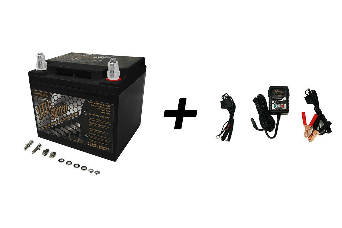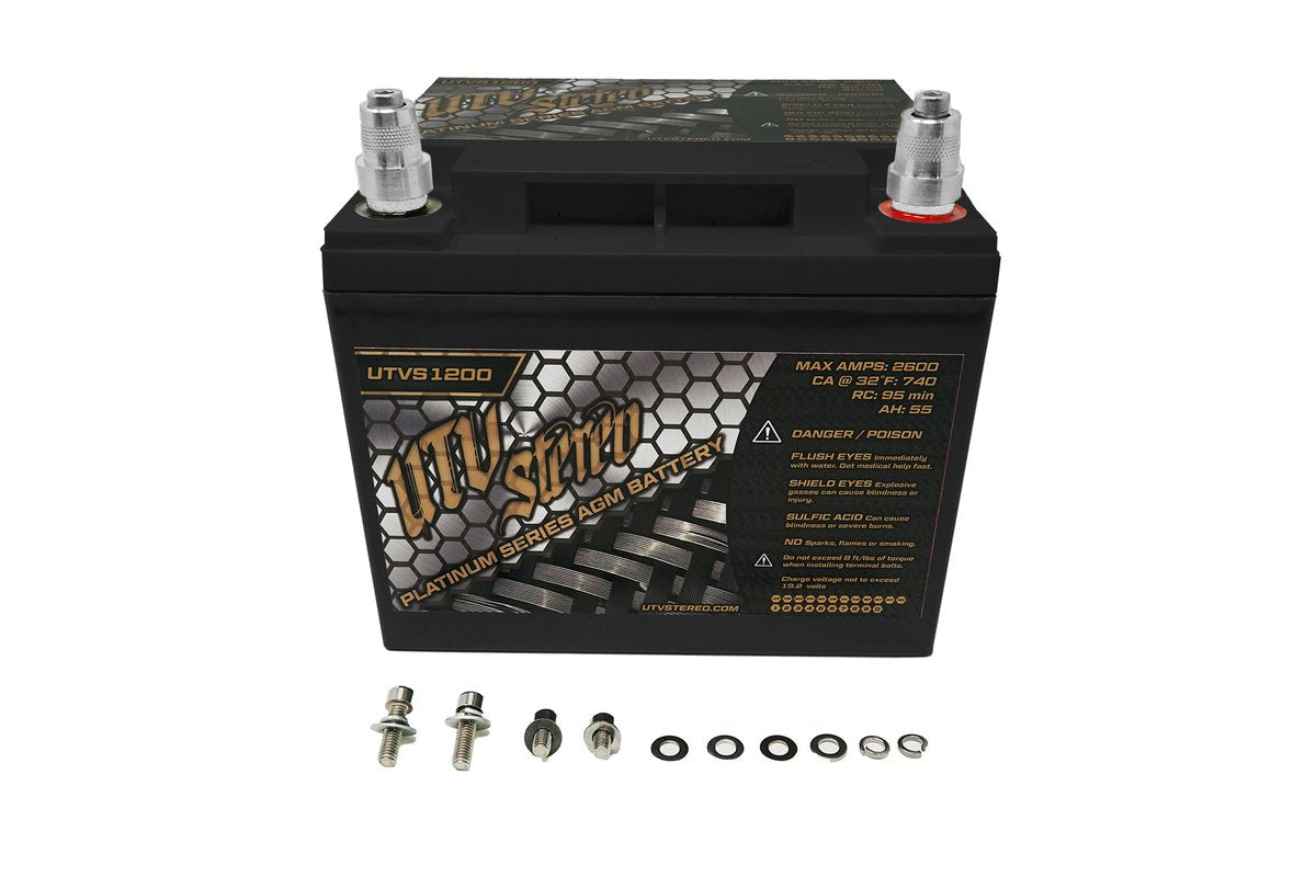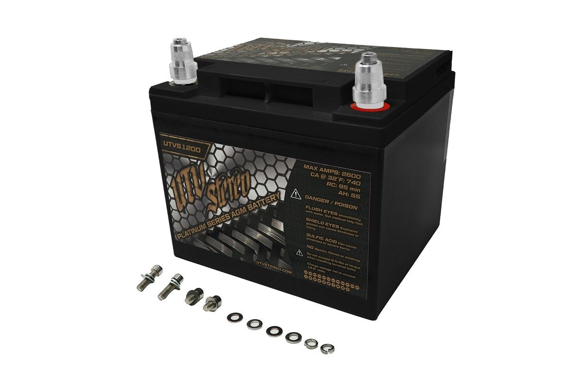 UTVS1200 is a prime replacement battery for your Polaris RZR starting battery or Can-Am X3 BIG Battery Upgrade. Our UTV Stereo Platinum Series AGM battery has very low internal resistance, is capable to deliver high currents on demand and offers a relatively long service life, even when deep cycled. AGM batteries must be kept on a battery charger / maintainer during storage in order to maintain optimal performance. Upgrade your battery with one of our platinum series batteries or battery kits.