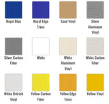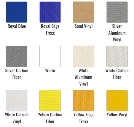 Aluminum Orange (+$ 0.00) Aqua Marine Vinyl (+$ 0.00) Black Carbon Fiber (+$ 0.00) Black Ostrich Vinyl (+$ 0.00) Black Perf (+$ 0.00) Brown Vinyl (+$ 0.00) Burgundy Vinyl (+$ 0.00) Dark Grey Carbon Fiber (+$ 0.00) Daytona Black (+$ 0.00) Dk Grey Vinyl (+$ 0.00) Forest Green Vinyl (+$ 0.00) Gunmetal Perf (+$ 0.00) Heide Marine Med Teal Vinyl (+$ 0.00) Lime Green (+$ 0.00) Lt Grey Vinyl (+$ 0.00) Lt Blue Vinyl (+$ 0.00) Med Grey Vinyl (+$ 0.00) Orange Edge Trexx (+$ 0.00) Orange Vinyl (+$ 0.00) Purple Vinyl (+$ 0.00) Red (+$ 0.00) Red Carbon Fiber (+$ 0.00) Red Edge Trexx (+$ 0.00) Royal Aluminum Vinyl (+$ 0.00) Royal Blue (+$ 0.00) Royal Edge Trexx (+$ 0.00) Sand Vinyl (+$ 0.00) Silver Aluminum Vinyl (+$ 0.00) Silver Carbon Fiber (+$ 0.00) White (+$ 0.00) White Aluminum Vinyl (+$ 0.00) White Carbon Fiber (+$ 0.00) White Ostrich Vinyl (+$ 0.00) Yellow Carbon Fiber (+$ 0.00) Yellow Edge Trexx (+$ 0.00) Yellow Vinyl (+$ 0.00)