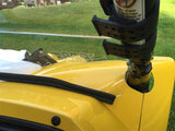 This is CNC routered from 3/16” Thick Hard Coated Polycarbonate making it very durable. A half shield is a great alternative to a full windshield. It allows for airflow keeping you cool and is low enough you can see over it when it gets dirty. It can easily be removed without any tools. Simply, unhook the rubber mounting straps. The bottom edge trim seals and protects your hood.
